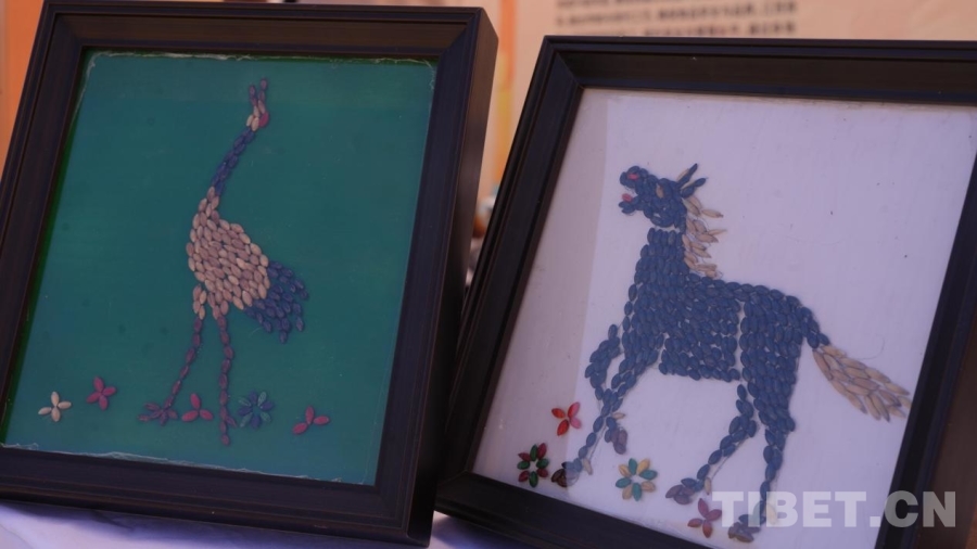 圖為林周縣籮曾繪畫工作室負(fù)責(zé)人仁青多吉用青稞粒創(chuàng)作的文創(chuàng)產(chǎn)品