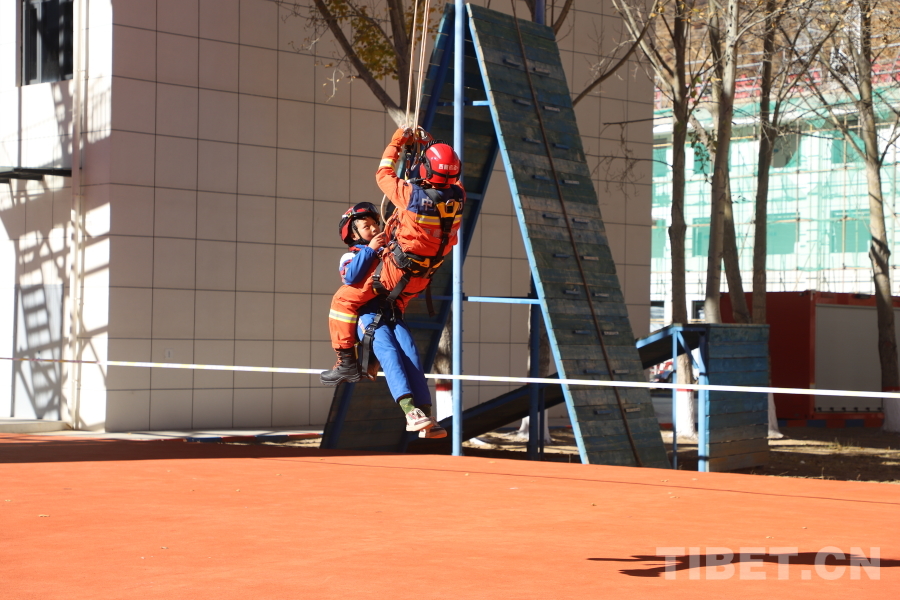 圖為模擬高空索降救援,消防員懷抱孩童安全演練,體驗(yàn)驚險(xiǎn)救援瞬間。