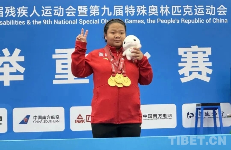 圖為特奧舉重女子90公斤級以上決賽中,運動員曲尼格桑奪得4枚金牌