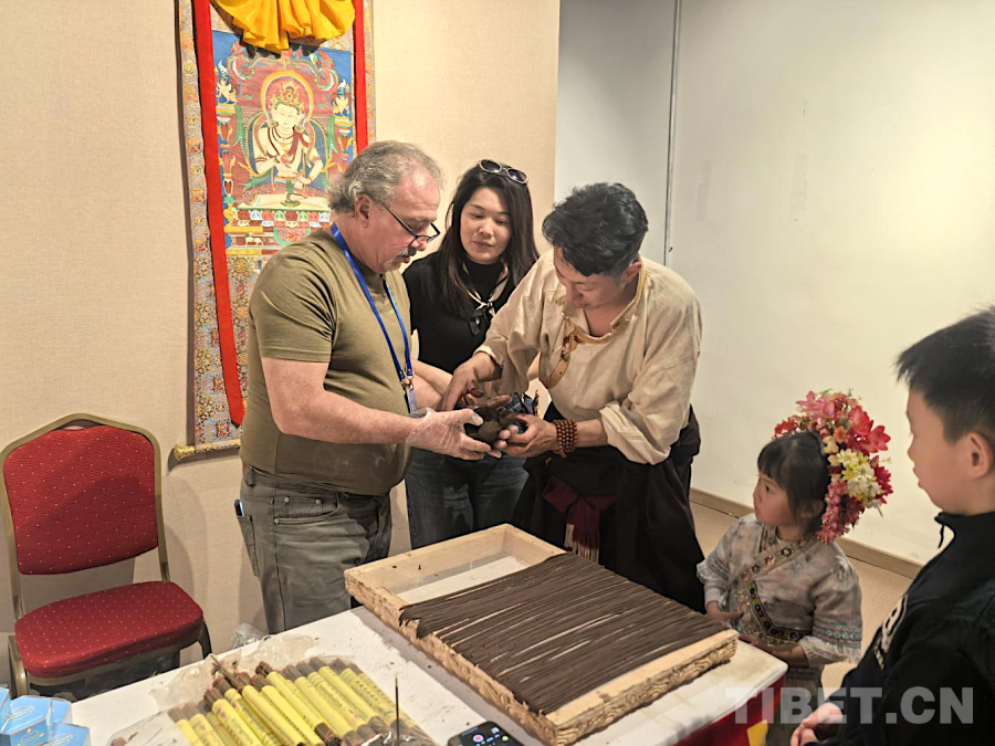 圖為參展現(xiàn)場,非遺傳承人正在教外國游客如何制作藏香