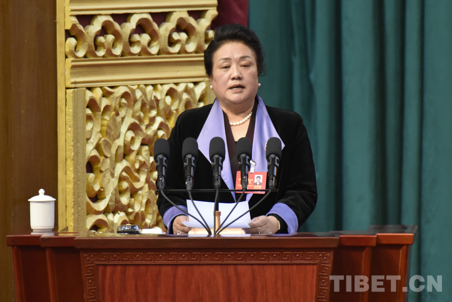 西藏自治區(qū)政協(xié)黨組成員、副主席卓嘎代表政協(xié)第十二屆西藏自治區(qū)委員會常務委員會向大會報告政協(xié)十二屆三次會議以來的提案工作情況。(中國西藏網(wǎng) 記者/王淑 趙振宇)