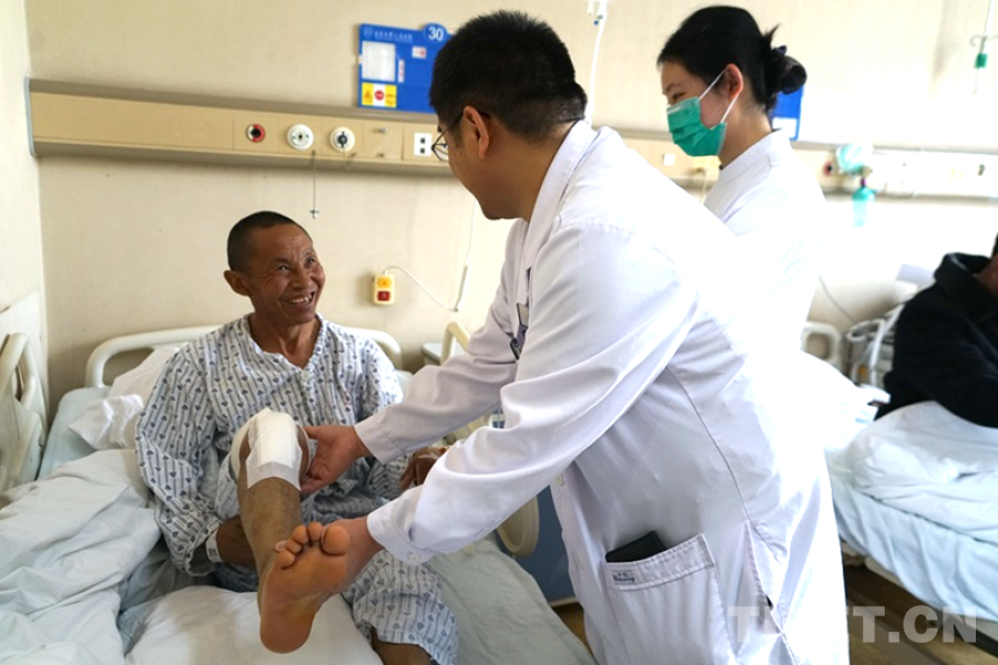 “現(xiàn)在感覺(jué)怎么樣?”“這里疼不疼?”走進(jìn)病房,北京大學(xué)人民醫(yī)院骨關(guān)節(jié)科支部書(shū)記、主任醫(yī)師李虎用藏語(yǔ)和患者扎西多吉進(jìn)行著簡(jiǎn)單的術(shù)后恢復(fù)情況交流。從2017年7月至今,李虎已經(jīng)赴藏21次,參與團(tuán)隊(duì)的大骨節(jié)病流調(diào)、篩查及手術(shù)治療工作。在和當(dāng)?shù)厝罕姷臏贤ㄖ校呀?jīng)掌握了一些簡(jiǎn)單的藏語(yǔ)。據(jù)李虎介紹,這次來(lái)京手術(shù)的,是大骨節(jié)病公益項(xiàng)目第十五批來(lái)自昌都洛隆的大骨節(jié)病患者,大部分是需要接受膝、髖關(guān)節(jié)置換手術(shù)的病人,也有一些情況相對(duì)復(fù)雜,需要做截骨矯形手術(shù),比較特別的是有一位需要進(jìn)行踝關(guān)節(jié)治療的小朋友,“希望能像前面的十四批患者一樣,取得很好的手術(shù)效果?!?/span>