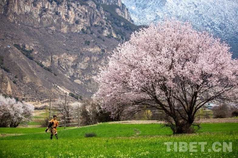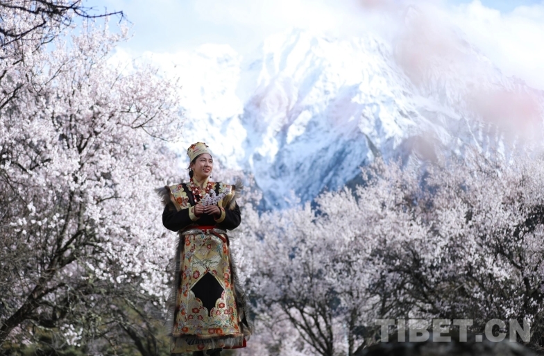 身著嘉黎特色服飾的姑娘,手捧桃枝,在雪山花海的映襯下,喜迎遠(yuǎn)方來(lái)客。