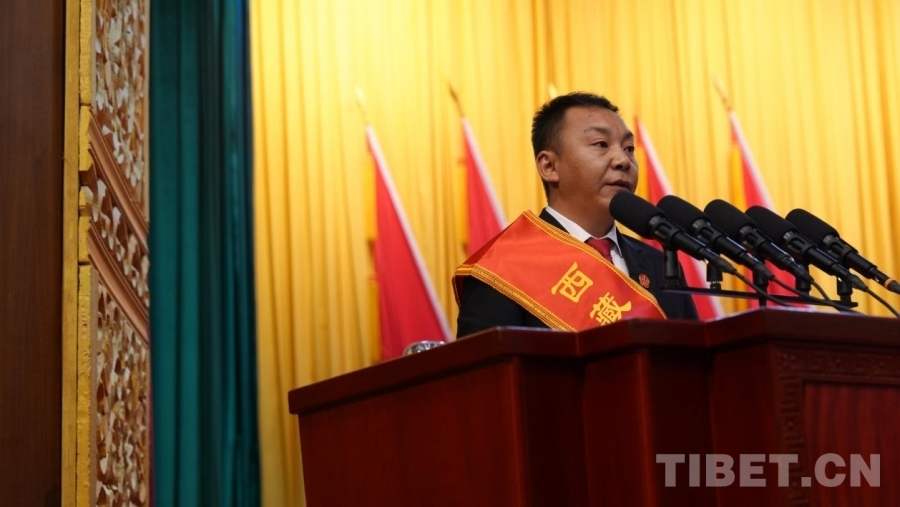 西藏工人先鋒號獲獎代表、安多縣人民法院雁石坪法庭庭長嘎瑪索朗加措發(fā)言