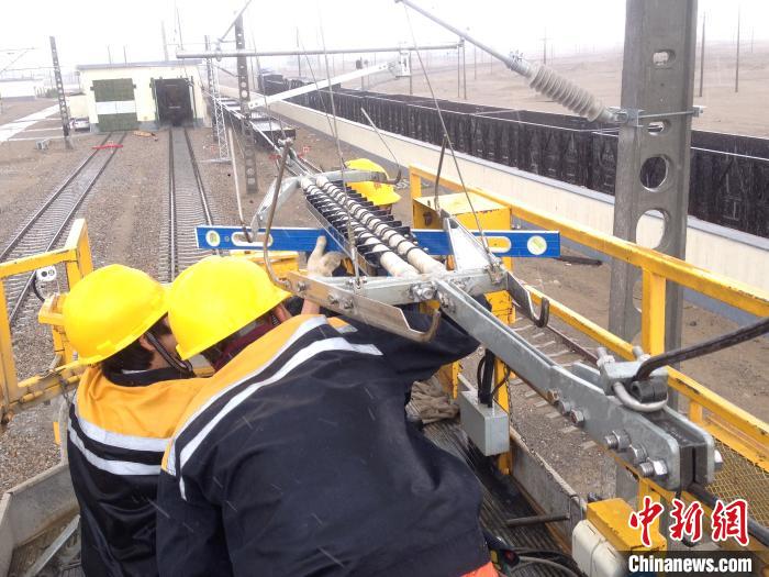 圖為中國鐵路青藏集團(tuán)有限公司西寧供電段格爾木接觸網(wǎng)大修工區(qū)的接觸網(wǎng)工對分段絕緣器進(jìn)行測量。周賀 攝