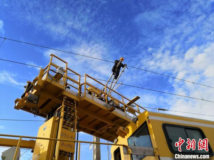 圖為中國鐵路青藏集團(tuán)有限公司西寧供電段格爾木接觸網(wǎng)大修工區(qū)的接觸網(wǎng)工進(jìn)行檢修作業(yè)。周賀 攝