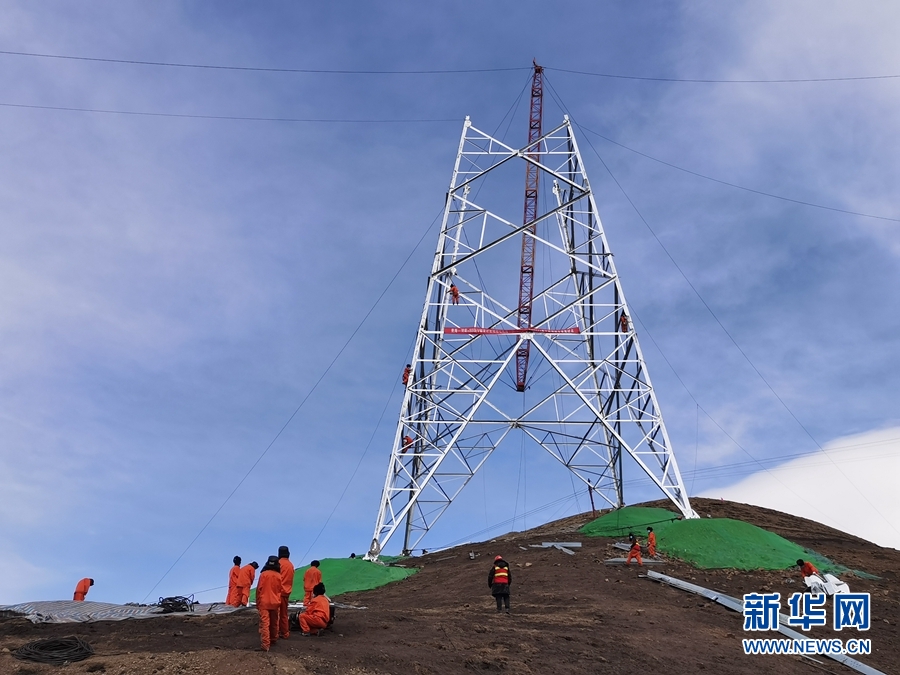 青海-河南±800千伏特高壓工程青2標(biāo)復(fù)工現(xiàn)場(chǎng),施工人員進(jìn)行組塔作業(yè)。新華網(wǎng) 鄒建華 攝
