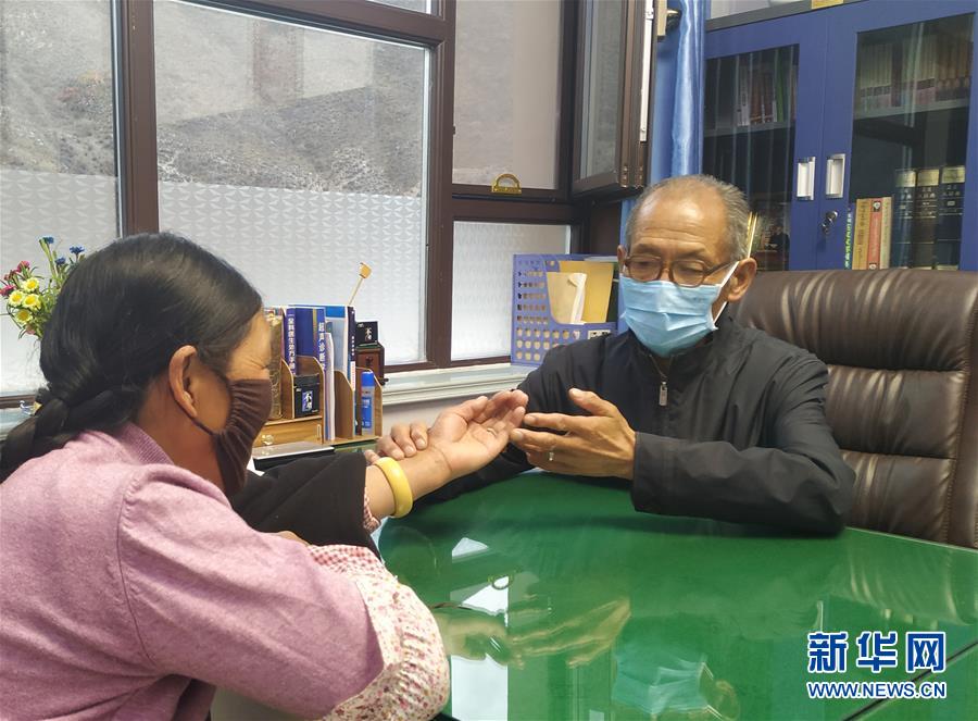 青才在位于青海省玉樹(shù)藏族自治州玉樹(shù)市仲達(dá)鄉(xiāng)電達(dá)村的藏醫(yī)診所為患者把脈(4月1日攝)。 新華社記者 王浡 攝