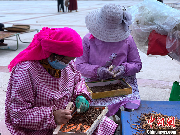 記者了解到,目前整個雜多蟲草廣場有十幾位刷草工,他們拿著折疊凳來回穿梭,碰到有需求的商家后立即就地干活。他們的收入由刷蟲草的數(shù)量決定,像王秀花這樣熟練的刷草工,一天能刷三四千根?!案刹輧擅?,濕草一毛,一天也能賺四五百塊錢。”王秀花說。