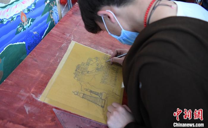 6月中旬,唐卡畫初級班里一名學(xué)生正在進行唐卡畫素描練習(xí)。中新社記者 劉忠俊 攝