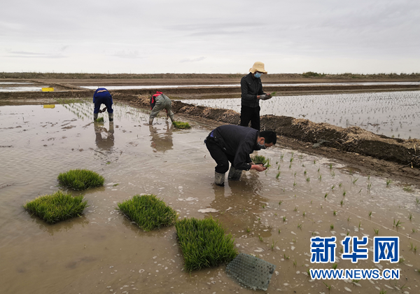 在青海省海西蒙古族藏族自治州格爾木市河西農(nóng)場,袁隆平海水稻科研團(tuán)隊(duì)的工作人員在試驗(yàn)田進(jìn)行人工插秧(6月15日攝)。新華社發(fā)(青島海水稻研究發(fā)展中心供圖)