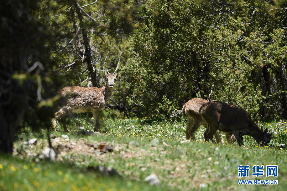 三只巖羊在囊謙縣吉尼賽鄉(xiāng)河谷的山坡上覓食。(6月20日攝)新華網(wǎng) 潘彬彬 攝