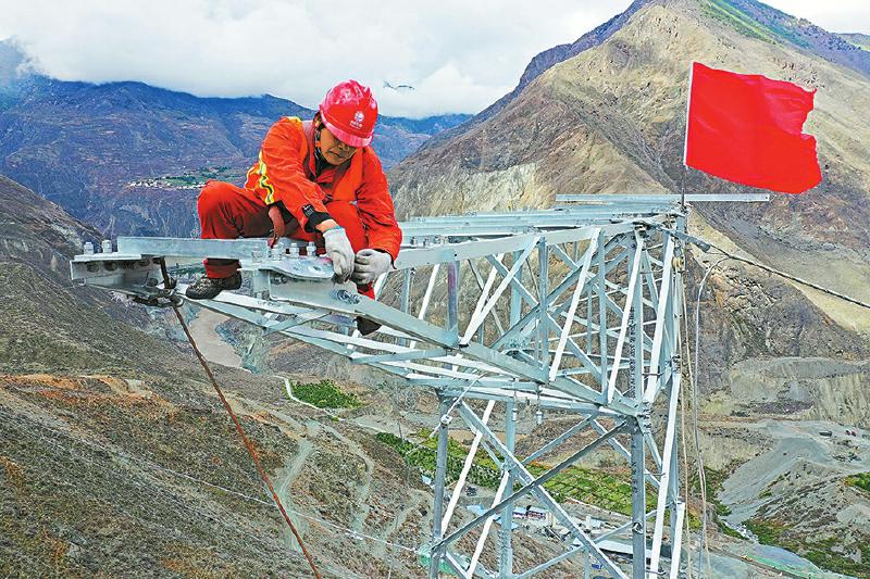 5月24日,甘孜州巴塘縣中咱-蘇洼龍35千伏線路工程78號(hào)塔放線現(xiàn)場(chǎng),施工人員正在塔上進(jìn)行放線作業(yè)。