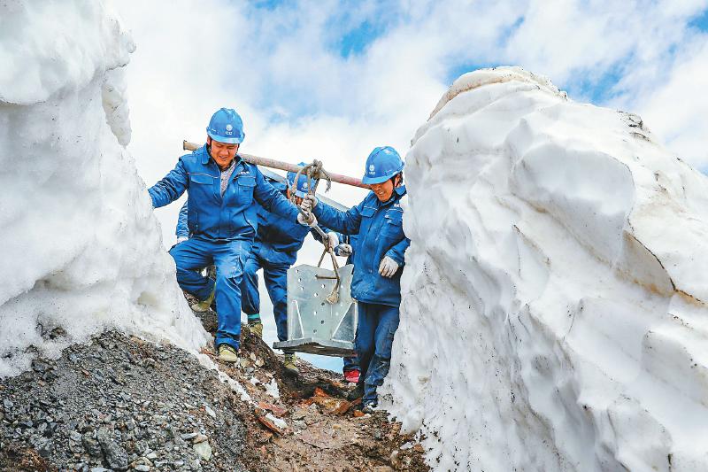 6月10日,阿壩州理縣夾壁—馬塘110千伏輸變電工程,建設(shè)者靠人力抬起沉重的塔材,艱難穿過(guò)高達(dá)2米的雪墻,前往組塔點(diǎn)位。
