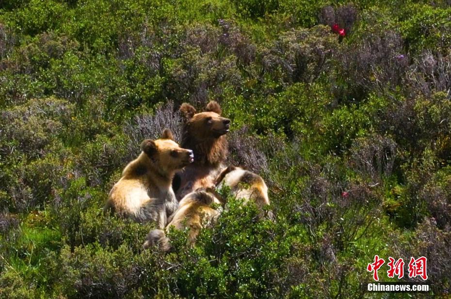 7月13日下午,記者下鄉(xiāng)采訪途中,在海拔4500米的四川省甘孜藏族自治州石渠縣蒙宜鎮(zhèn)蒙格村附近一處水草豐茂的山坡處拍攝時,偶然發(fā)現(xiàn)一只棕熊媽媽曬著陽光浴給三只小熊喂奶場景,棕熊媽媽喂奶結(jié)束后領(lǐng)著小熊寶寶們緩慢走向大山深處。