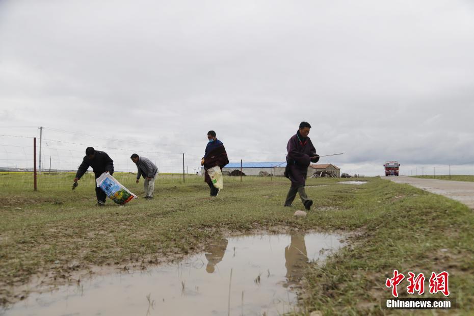 7月21日,青海省海北藏族自治州剛察縣伊克烏蘭鄉(xiāng)剛察貢麻村的萬瑪扎西、索南木旦巴、仁增才讓、吉科加四人在撿拾著草場垃圾。2008年,萬瑪扎西路在村支書的支持下,與索南木旦巴、仁增才讓、吉科加三個人組建了義務(wù)環(huán)保隊,自此一干就是12年。他們在撿拾垃圾的同時進(jìn)行著環(huán)保宣傳,希望從源頭減少垃圾。仁增才讓說:“現(xiàn)在草原上的垃圾幾乎是看不到了?!敝行律缬浾?馬銘言 攝