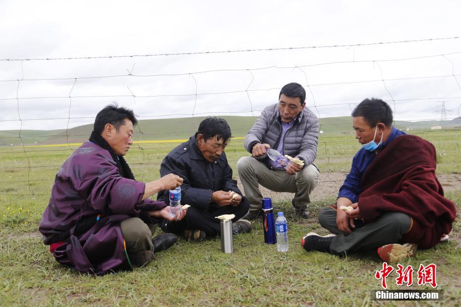 7月21日,青海省海北藏族自治州剛察縣伊克烏蘭鄉(xiāng)剛察貢麻村的索南木旦巴(左一)、仁增才讓(左二)、吉科加(右二)、萬瑪扎西(右一)四人在撿拾著草場垃圾途中,吃餅子,喝礦泉水充饑。2008年,萬瑪扎西路在村支書的支持下,與索南木旦巴、仁增才讓、吉科加三個人組建了義務(wù)環(huán)保隊,自此一干就是12年。他們在撿拾垃圾的同時進(jìn)行著環(huán)保宣傳,希望從源頭減少垃圾。仁增才讓說:“現(xiàn)在草原上的垃圾幾乎是看不到了。”中新社記者 馬銘言 攝