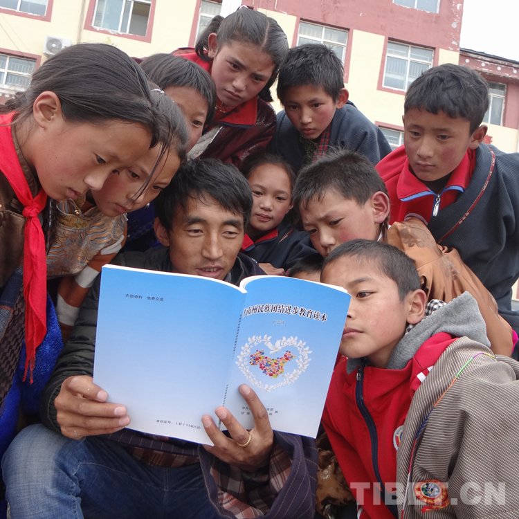圖為甘南州瑪曲縣齊哈瑪鄉(xiāng)寄宿制學(xué)校的師生在學(xué)習《甘南州民族團結(jié)進步教育讀本》