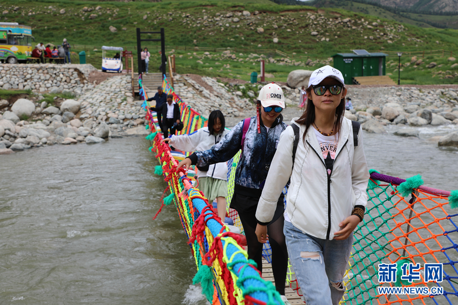 援鄂醫(yī)療隊(duì)員和家屬走過冰溝河景區(qū)“彩虹橋”。新華網(wǎng) 童張偉 攝