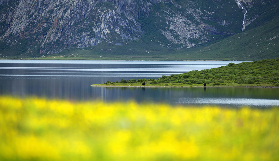 站在年保玉則的湖畔,湖面幽藍深邃像是一面鏡子,時間仿佛在這一刻都停止了,寧靜和心靜。望向遠處,山峰疊巒直插縹緲的白云中;看向身旁,五顏六色的小花鋪滿了湖岸,牦牛低頭飲著湖水,成群的裸鯉游走在湖邊,這是生命的動靜。