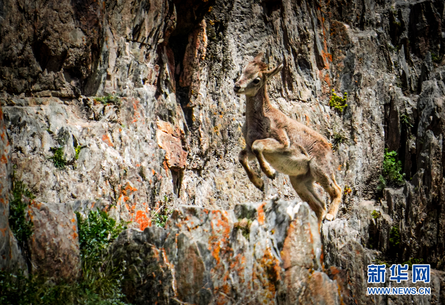 一只小巖羊在巖壁上嬉戲。新華網(wǎng) 宋忠勇 攝