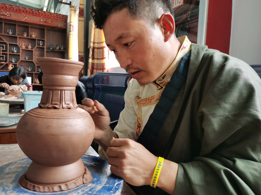 囊謙黑陶歷史悠久,山榮村被稱作“黑陶之鄉(xiāng)”。村里成立了企業(yè),將現(xiàn)代藝術(shù)的創(chuàng)作理念融入黑陶制作中,使囊謙黑陶散發(fā)出濃郁特色。黑陶原材料與制作工具都從當?shù)厝〔?,許多村民學手藝“靠山吃山”。