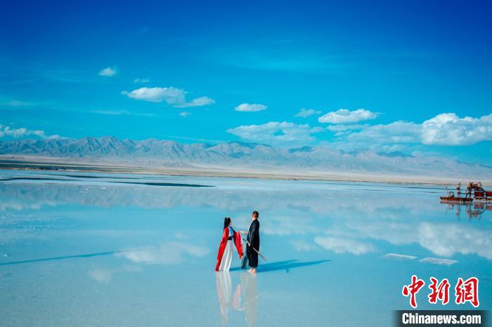 圖為身穿傳統(tǒng)服飾的游客在茶卡鹽湖拍照。印象合祈 供圖 攝