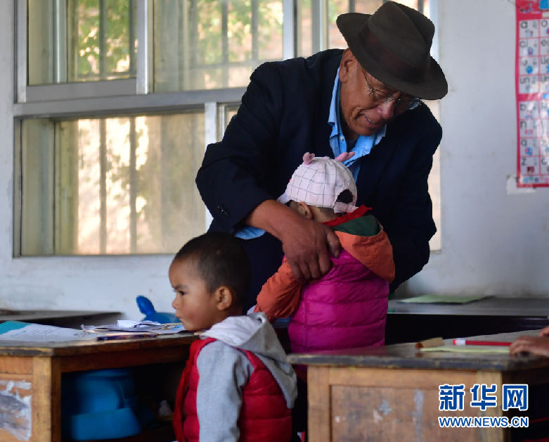 8月31日,在來塘村學(xué)校,完么仁增老師在上課前將學(xué)前班的孩子馬玲抱到椅子上。新華社記者 張龍 攝