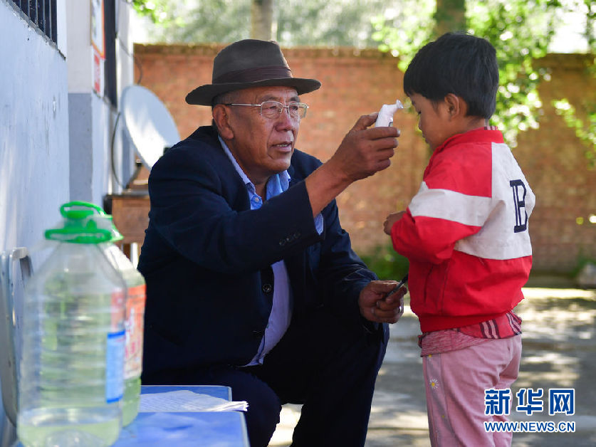 8月31日,在來塘村學(xué)校,完么仁增老師在給前來上課的孩子量體溫。新華社記者 張龍 攝