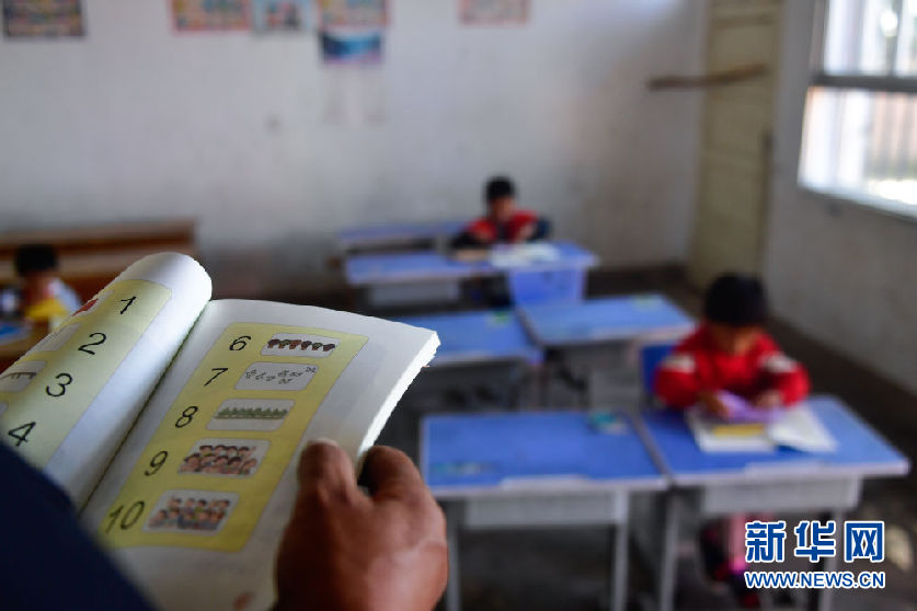 8月31日,在來塘村學(xué)校,完么仁增老師在指導(dǎo)一年級學(xué)生馬秀梅學(xué)習(xí)。新華社記者 張龍 攝