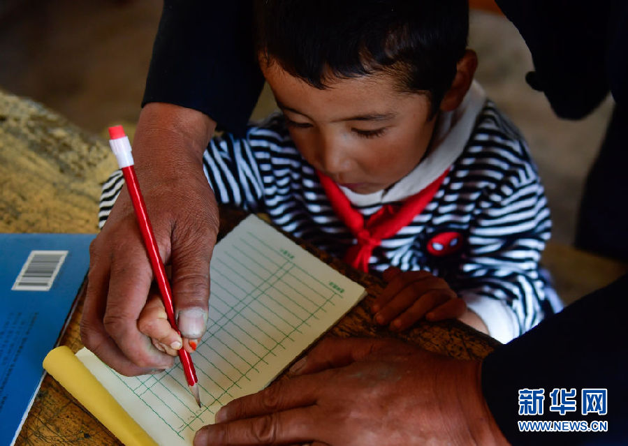 8月31日,在來塘村學(xué)校,完么仁增老師在指導(dǎo)一年級學(xué)生馬文輝學(xué)習(xí)。新華社記者 張龍 攝