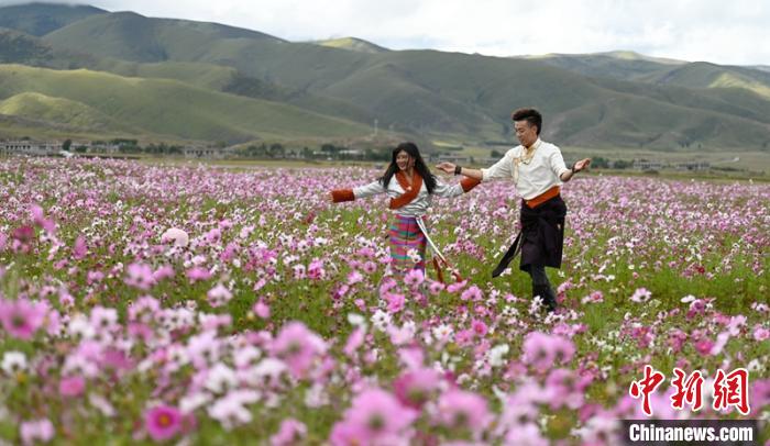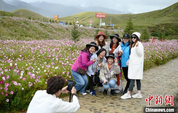 9月9日,四川省甘孜藏族自治州稻城縣金珠濕地公園一望無際的格桑花海姹紫嫣紅,過往車輛和游客們紛紛下車,走進濕地公園用手機直播和拍照留念。