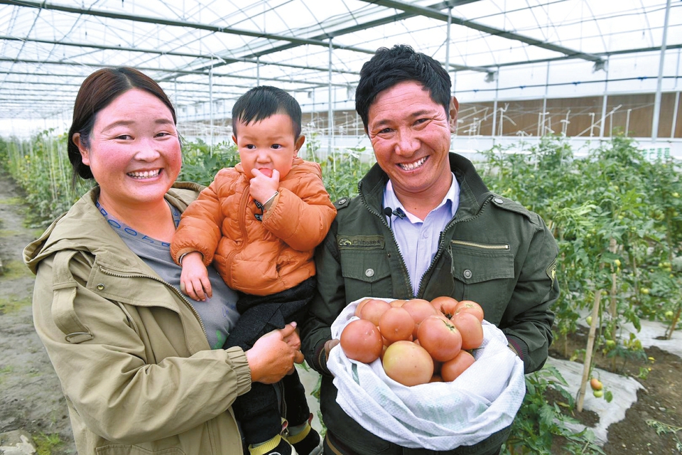 捧著種出的西紅柿,旦真貢(右)笑逐顏開。