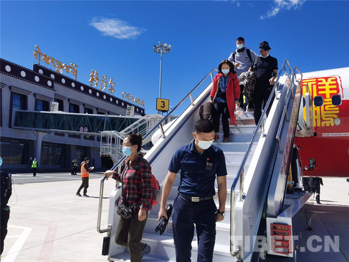 圖為游客抵達(dá)格薩爾機(jī)場(chǎng)