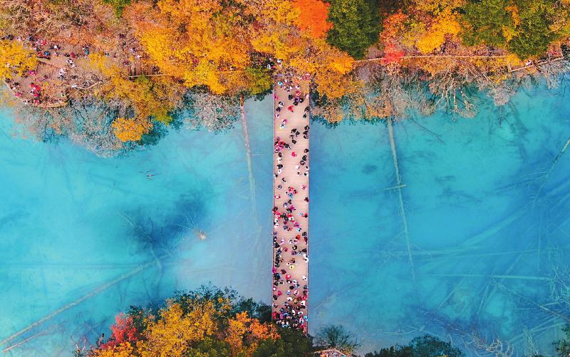 各地游客走進九寨溝景區(qū)游覽。蘇楊 攝