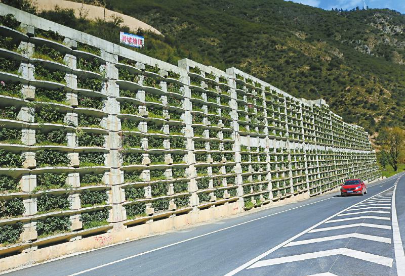 災(zāi)后重建中,九寨溝縣進行地災(zāi)治理,并栽花種草,進行綠化、美化,圖為公路擋墻變花墻。易西 攝