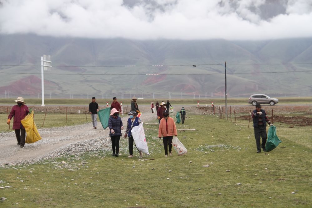 一開始,跟他們撿拾垃圾的只有附近幾個(gè)牧民,耳濡目染下,越來越多的人加入志愿隊(duì)。后來,機(jī)關(guān)單位、學(xué)校、醫(yī)院、企業(yè)的干部職工也參與進(jìn)來。撿拾垃圾的隊(duì)伍里不僅有年輕人,也有老人和孩子。撿垃圾的范圍也擴(kuò)展到縣城周邊更遠(yuǎn)的地方以及立新鄉(xiāng)、扎河鄉(xiāng)、多彩鄉(xiāng)等地。