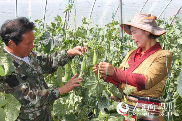 “你們要把瓜葉分叉中長出的小瓜叉去掉,這樣就能減少瓜養(yǎng)分的消耗,長出的西瓜才能又大又甜。”一位山東漢子在蔬菜大棚里向當?shù)氐霓r(nóng)牧民傳授種植西瓜的心得。2016年10月,理塘縣引進瑪吉阿米農(nóng)業(yè)開發(fā)有限公司,修建58個現(xiàn)代化標準大棚,并從山東引進了溫帶瓜果蔬菜的現(xiàn)代化種植技術(shù)。