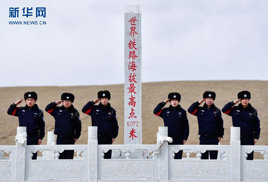 2月4日,沱沱河站派出所巡線民警在“世界鐵路海拔最高點”標(biāo)志碑前合影。新華社記者 張龍 攝