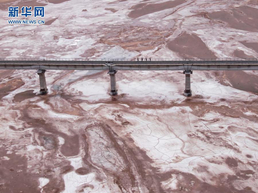 2月5日,沱沱河站派出所的巡線民警在青藏鐵路沱沱河大橋巡查(無人機照片)。新華社記者 張龍 攝