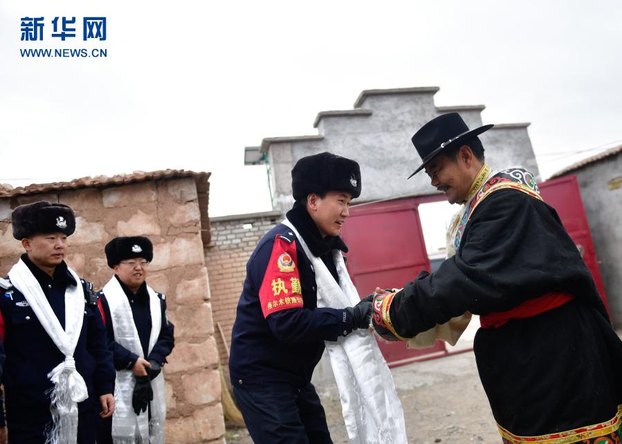 2月5日,沱沱河站派出所巡線民警到格爾木市唐古拉山鎮(zhèn)格日村義務(wù)護路隊員革命花(右一)家中慰問時接受哈達。新華社記者 張龍 攝