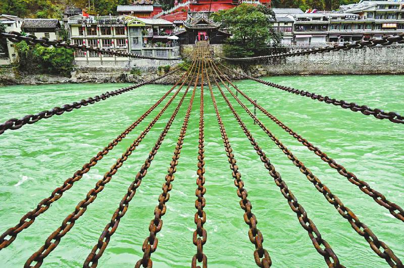 瀘定橋始建于清康熙四十四年(1705年),是大渡河上建造最早最長的一座橋梁,橋身由十三根鐵鏈組成,下邊九根作為底鏈,兩邊四根作為扶手,橋長101.67米,橋寬3米,由12164個鐵環(huán)組成,十三根鐵鏈重達21噸。