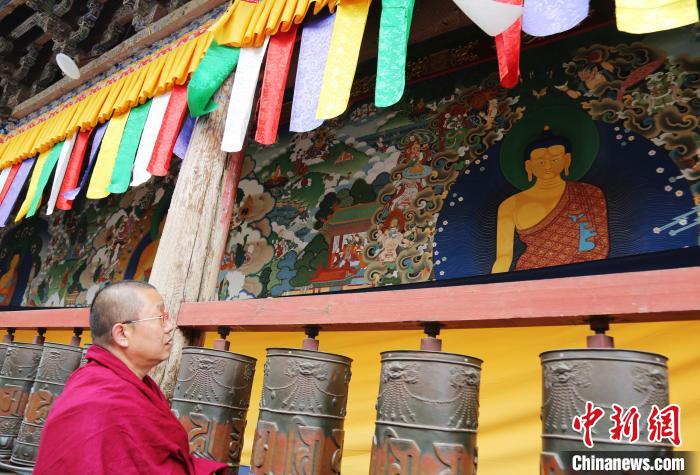 圖為印巴尖措為塔爾寺釋迦牟尼佛殿繪制的長(zhǎng)30多米的大型壁畫(huà)《釋迦牟尼生平圖》。張?zhí)砀?攝