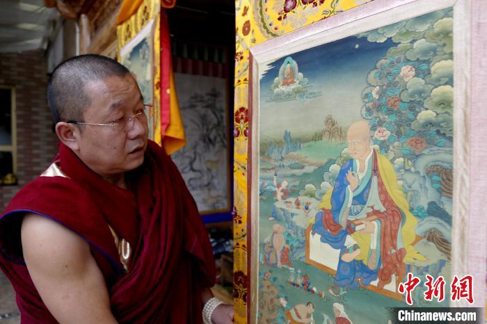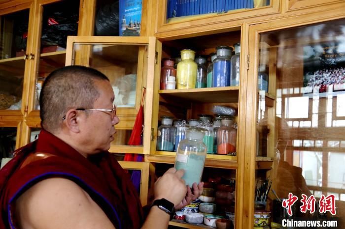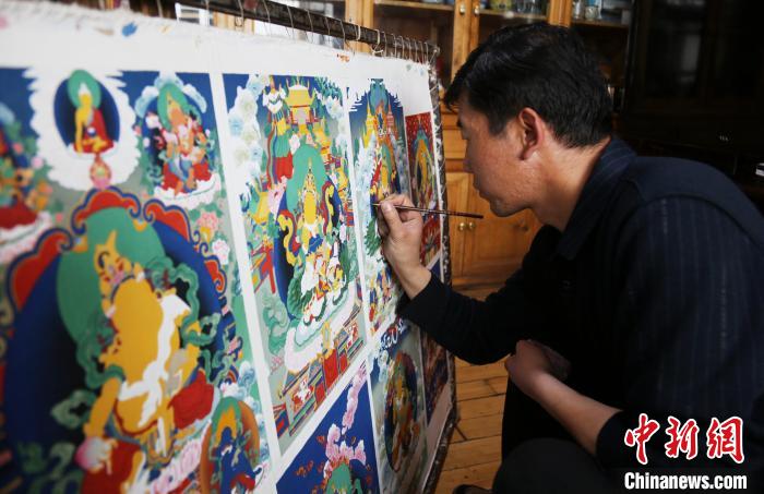 圖為印巴尖措畫(huà)唐卡。張?zhí)砀!z
