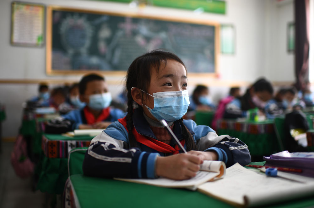 玉樹市第三完全小學(xué)二年級一班學(xué)生求永藏嘎在上課(2020年4月9日攝)。