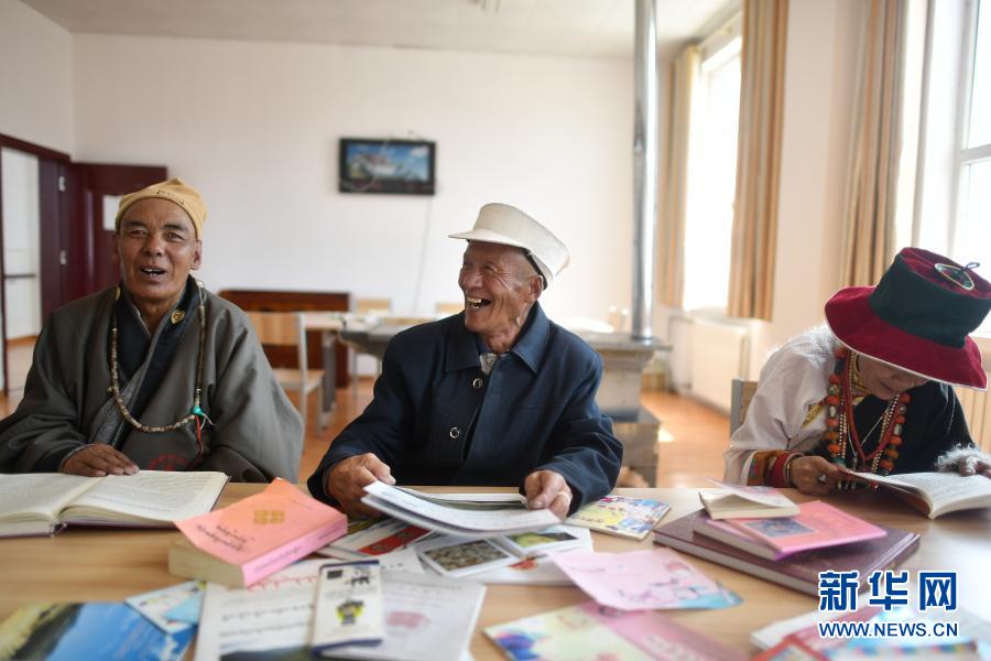 3月14日,78歲的公保(中)和同伴在治多縣幸福敬老院閱覽室內(nèi)讀報(bào)。新華社記者 張宏祥 攝