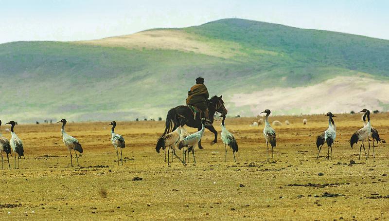 3月6日,今年的第一批黑頸鶴比往年提早了半個(gè)月飛回若爾蓋濕地,大草原上呈現(xiàn)出人與珍稀鳥(niǎo)類和諧共處的溫馨畫(huà)面。尹鋼 攝