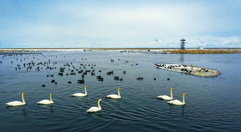 3月6日,若爾蓋濕地國(guó)家級(jí)自然保護(hù)區(qū)在花湖設(shè)立的高科技無(wú)人觀測(cè)塔(右后)正全天候觀察濕地鳥(niǎo)類的活動(dòng)。尹鋼 攝