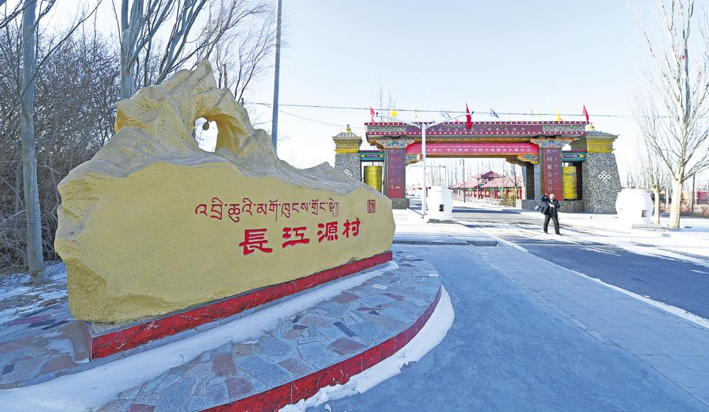 從格爾木市區(qū)沿109國道一路向南,車子行駛在廣闊平坦的公路上,窗外的景色緩緩?fù)撕?。忽然間,路旁一塊刻有“長江源村”字樣的巨石撲入眼簾,像一面破浪前行的風(fēng)帆,亦像一座拔地而起的豐碑,與一旁極具藏民族特色的大門交相輝映。站在村口放眼望去,一排排藏式風(fēng)格的庭院錯落有致,屋頂上一面面五星紅旗獵獵招展,將湛藍(lán)的天空映襯得分外純凈。