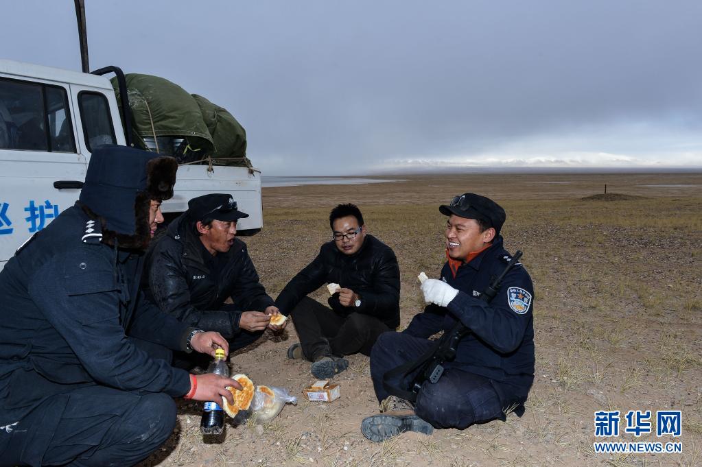 2014年12月26日,袁廣明(右二)和隊(duì)友進(jìn)入可可西里巡山吃飯。新華社記者 吳剛 攝
